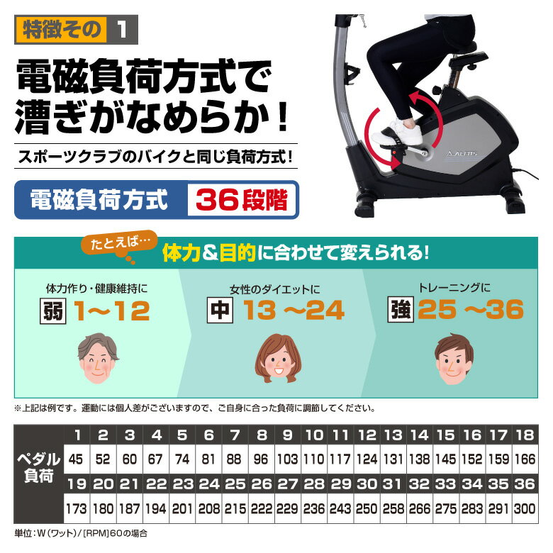 製品名 アドバンストバイク7218 型番 AFB7218 製品サイズ W540 × D1,060 × H1,365mm 梱包サイズ W280 × D1,020 × H660mm 重量 ■本体:約35.5kg■梱包:約39.0kg 材質 スチール/ABS/PVC/PU 使用制限体重 135kg 連続使用時間 60分 JAN 4969182513097 メーカー保証 ご購入日より1年間 商品説明 ■ペダル負荷36段階(電磁負荷方式)■パルスセンサー:グリップセンサー方式■運動中の最大心拍数を表示するハートレートモニター搭載■サドル高さ調節幅:約855〜1,090mm(30mmピッチ9段階)■ハンドル角度調節可能■電源:AC100V(50/60Hz)■定格消費電力:50W■トレーニングメニュー内蔵■心拍数測定可能■体力評価機能搭載■ペダルバンド付き■タブレットトレー付き■USB電源付き■移動用キャスター付き 広告文責 アルインコ株式会社TEL:06-7636-2351 メーカー(製造)・輸入者名 アルインコ株式会社 区分 健康器具 生産国 中国